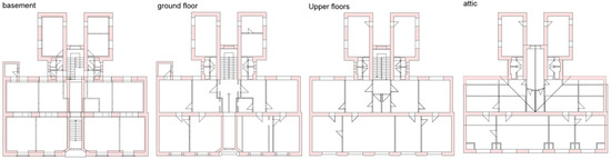 Figure 4). The basement has a height of 3 m, while the ground and first floors are 3.5 m high. The total height of the building is 22.70 m. The annexes on the courtyard side of the existing building are connected to its main part, which faces the street. The floor plan of the building is relatively irregular, with heterogeneous floor structures.