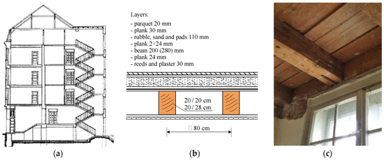 Figure 5) located above the basement on the street side of the building is a solid RC slab with a system of RC beams. As for the upper floors, they feature timber joists that are arranged in a transverse manner, with rubble filling used in the floor structure. During renovations, RC slabs measuring 8 cm in thickness were added above the ground floor and the third floor on the southern side of the building. The floor structure consists of timber joists with a layer of concrete with unknown reinforcement and properties on top. In the middle part of the building next to the staircase landing, there is an RC slab supported by RC beams on the edge.