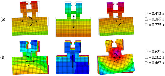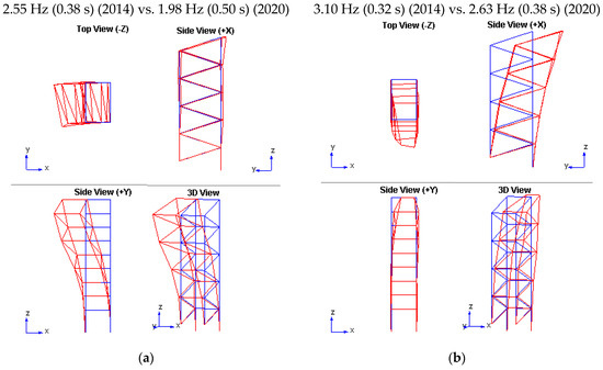 Figure 12 shows the natural vibration modes of both models. The second vibration shape does not fully match the shape in the Y direction obtained via measurement since the partition walls are not modeled in the numerical model. In addition, the influence of the adjacent building is neglected. Modal participating mass ratios indicate that in the first natural periods in directions X and Y, the activation of the model mass is larger than 60%.