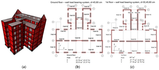47] through the implementation of the finite element method. A three-dimensional representation of the numerical model that shows a vertical and horizontal load-bearing system is shown in