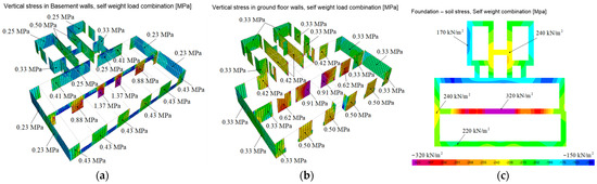 Figure 11 show the load-bearing elements’ normal stresses due to the permanent vertical loads in the basement and on the ground floor. The average stresses of the walls are mainly between 0.3 and 0.6 MPa.
