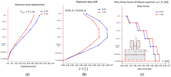 It can be observed that the maximum displacements are close to reaching the SD limit state and are up to 6 cm for the X direction and 5 cm for the Y direction in the attic. The maximum value of story drift for the X direction is approximately 0.004 (Δ/h = 0.4%), which is also the bounding value for the SD limit state for elements for which the shear failure mechanism is critical. This is not realistic since the model is linear–elastic, so displacement can be expected to be larger.