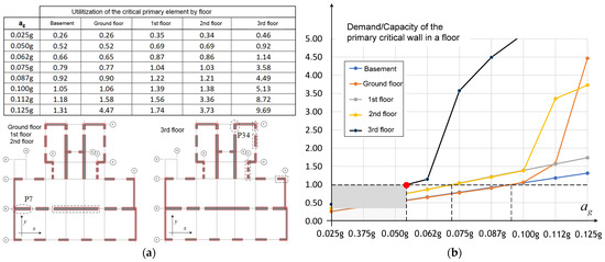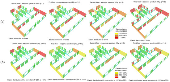 Figure 14 shows the results of wall seismic capacity analysis. It is evident that many elements exceed their shear force capacity by more than 200%, with some walls exceeding the load factor by more than 300%, which is well above the permissible values. In order to account for redistribution of forces due to nonlinear behavior of elements in this type of linear analysis, a redistribution of forces in load-bearing elements ranging from −25% to +33% was performed (according to the Eurocode). The condition for the application of the redistribution is that the resultant lateral force is unchanged (same intensity and position in each story).