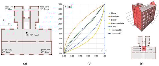 Figure 16b shows the distribution patterns of acceleration along the height of the building. The load is applied in both the positive and negative directions of lateral force in the X and Y directions. Furthermore, the eccentricity value is regarded as being within a range of ±5% of the perpendicular plan dimension to the CM. A total of 72 calculations were carried out, of which only the most significant findings are showcased.
