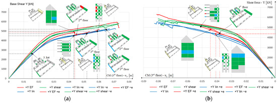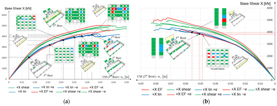 Figure 17a illustrates the most important structural capacity curves for the positive direction X obtained using the load pattern of the lateral force method (red curves X/Y EFn) and the linear distribution (blue curves X/Y lin). The number in front of the marking indicates different directions and values of eccentricity. For a qualitative representation of the failure mechanism and the behavior of critical structural elements, key points on the curve are annotated to indicate structural element damage.