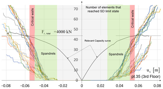 Figure 19 presents a diagram showcasing the cumulative count of elements that reached the significant damage limit state. The diagram overlaps with the most important bearing capacity curve for the X direction. An area where the spandrels begin to enter a state of SD (highlighted in green) can be observed. It can be seen that in this area, a large number of spandrels, depending on the load case, enter a state of SD, and for critical cases already analyzed, the number is 38. After that, at a displacement of CM of about 5.1 cm, the critical pier enters a state of SD (red area), and soon after that, the critical pier also fails (near the red area).