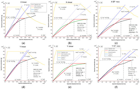 Figure 20a,d show idealized bearing capacity curves of an equivalent SDOF system for a PGA of 0.125 g (r.p. 95 years—level 2) and for linear load distribution without eccentricity. The system’s deformation capacity in both directions is higher than required. The maximum PGA value that would satisfy the demand in this case of load distribution is approximately 0.17 g for the X direction and 0.16 g for the Y direction. It should be noted that this load case is not paramount but is presented only to illustrate the main parameters and coefficients.