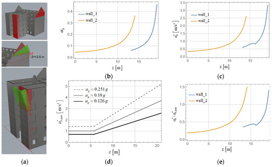 Figure 21d. When comparing demand values with those obtained in the analysis, it was evident that for the return periods of 475 and 225 years, it does not satisfy requirements for all considered mechanisms except for wall_3. However, it should be mentioned that the formation of the line hinge of wall 2 below z = 10 m is unlikely because this mechanism assumes the formation of cracks on all spandrels of the orthogonal wall that will contribute to the separation of the considered wall. Furthermore, for the 95-year return period, the activation demand was satisfied in the case of a line hinge forming above the height of 13 m for the west courtyard wall (wall_2), and for gable (wall_1) above approximately z = 18.5 m. Nevertheless, it is worth mentioning that this analysis considered only the activation of the mechanism and not the eventual overturning of walls. Furthermore, this criterion is in most cases conservative, which is common of linear methods. Although the position of the line hinge of the presumed mechanisms shifted toward higher floors and the value of the activation acceleration increased, which was favorable, the walls of higher floors were still more prone to out-of-plane failure. Elements of the higher floors tended to be subjected to higher values of floor acceleration and generally had fewer connections, which constrained the mechanism to some extent, or like gable wall_1, they had no constraint at all. In the case of the two-story bending mechanism (wall_4), our investigation of the 95-year return period of seismic action returned an acceptable degree of safety. However, the formation of this kind of mechanism is highly dependent on adequate constraint at the top of the mechanism.