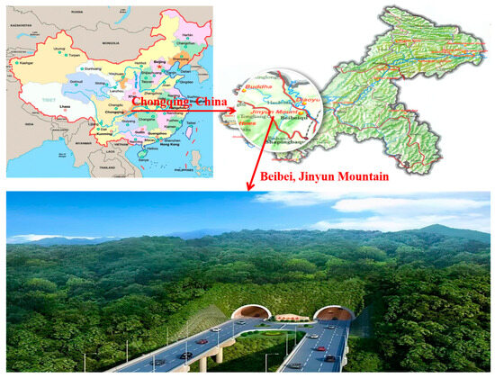 This study relies on the Jinyunshan tunnel at the Sui-Yu expressway complementary line (Beibei-Tongliang section) in Chongqing city, China, to investigate the rock mass deformation and the mechanical behaviors of the support structure when the tunnel crosses the water-abundant fault area. The Jinyunshan mountain, which is located in the central region of the bar-shaped mountain range, is the small-type branch of Huaying mountain. Its lateral topography and geomorphology are strictly controlled with the geological structure, showing a pattern of a wide trough valley and anticline mountain. The east and west sides of the Jinyunshan mountain are an oblique trough area, with the erosion of hilly terrain and the regional erosion datum. The Jinyunshan tunnel is a separate double-hole tunnel. The left tunnel is 2828 m long, with an elevation of 303.980–345.588 m. The right tunnel is 2845 m long, with an elevation of 303.978–345.815 m. It is buried at a maximum depth of 180.4 m, and the excavation height and span are about 15.5 m and 17.5 m, respectively. A fault zone (F1) is developed in the tunnel site, with a fault distance of 40–150 m and a dip angle of 60–85°. The rock mass near the fault is broken, and the occurrence is chaotic. Drill cores reveal that the F1 fault has extended to the karst trench valley section, and there is abundant water within the fault. The geographic position of the Jinyunshan tunnel is presented in Figure 1.