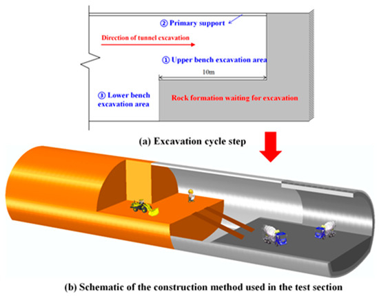 The commonly used methods of tunnel excavation include the full-section excavation method, the step method, the middle partition wall method, and so on. Because the step method can increase the working face, the front and back interference is small, which is conducive to mechanized operation and high excavation efficiency, so the step method is the most commonly used method. The two-bench tunneling method is adopted for the Jinyunshan tunnel crossing the water-abundant fault area. The upper bench of the rock mass is first excavated, followed by the installation of temporary support on the excavated part, and then the lower bench of rock mass is excavated and the temporary support is installed, and the process is cyclic in sequence. The distance between the upper and lower bench excavation faces is 10 m. The construction of the lining starts when the location with initial support installed is 30 m away from the upper bench excavation face. The specific construction steps are illustrated in Figure 2.