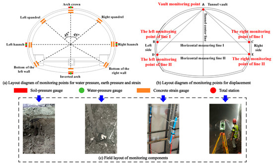 The water-abundant fault area in the ZK4+880–ZK4+940 sections of Jinyunshan tunnel is selected for study. Among them, the monitoring section I is in grade V surrounding rock, while the monitoring section II is in the fault fracture zone, and both sections are 5 m away from the fault interface. The water and soil pressures in the rock mass outside the primary support are monitored with a DMKY-type pore water pressure transducer and DMTY-type soil pressure gauge, respectively. The strain on the secondary lining is monitored by a vibrating string concrete strain gage, while the displacement of the primary support is measured using a Laika TS09 plus-type Total station. The arrangement of monitoring components and monitoring points’ distribution are presented in Figure 3.
