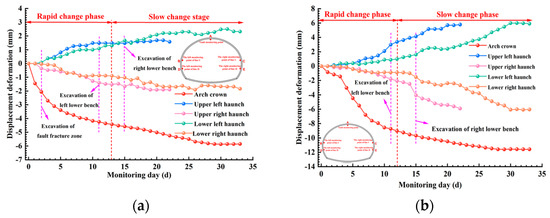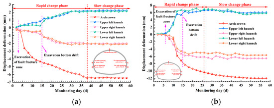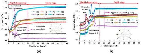 The implementation of the upper bench excavation results in a rapid increase in stress concentrations in two sections, with the stresses at all monitoring points in section I being smaller than those in section II. When the excavation face reaches section I, a sudden change occurs in the stress at each monitoring point within this section. The rate of stress growth at the arch haunch on both sides reaches its maximum, followed by the arch feet and arch spandrel. The stresses at the arch crown and inverted arch demonstrate negative growth, with the stress at the arch haunch being approximately 70–80% greater than those at the arch spandrel and the bottom of the left and right wall. Upon reaching the fault zone, the stresses at all monitoring points in section I, excluding the inverted arch (M5), display a growth trend, with the rate of growth remaining essentially constant. However, the stresses at the monitoring points of the upper bench in section II (vault M1, left and right arch spandrels M2 and M8) exhibit fluctuations. With the completion of the primary support, the stresses at the upper bench exhibit a steady increase following a temporary decrease. Simultaneously, the rock stresses at the arch haunch on both sides in this phase rapidly escalate from their minimum to maximum, with the rock mass at the arch haunch in section II bearing the majority of the rock stress. The excavation of the lower benches in sections I and II results in an increase in the stresses at the arch haunch on both sides, while the stress at the inverted arch decreases. Once the primary support of the upper and lower bench is closed, rock stress becomes essentially stable. Primary support effectively manages the growth of rock stress and prevents the deformation of weaker rock masses. The pronounced effects are observed at the interface between the Grade V rock mass and the fault zone. The stress distribution pattern in section I consists of arch haunch on both sides, bottom of the right wall, right arch spandrel, bottom of the left wall, left arch spandrel, arch crown, and inverted arch, in descending order. Similarly, in section II, the pattern is arch haunch on both sides, arch spandrel on both sides and arch crown, arch foot on both sides, and inverted arch, also in descending order.