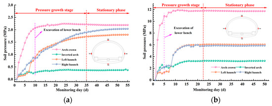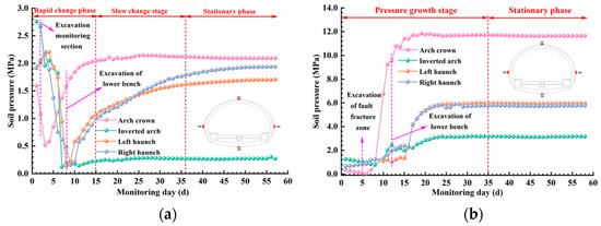 Time-dependent curves of soil pressure monitored in the field. (a) section I; (b) section II.