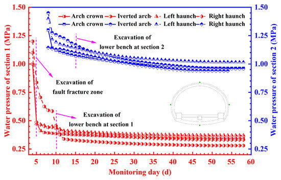 At the beginning of excavation, the water pressure at each monitoring point in section I decreases sharply. When the excavation face reaches section I, the water pressure at the vault decreases from the initial 0.9 MPa to 0.4 MPa, while that at the inverted arch decreases from the initial 1.2 MPa to 0.6 MPa. The water pressure in section II at this point presents a slow decreasing tendency. The water pressure at the vault decreases from the initial 1.31 MPa to 1.25 MPa, while that at the inverted arch decreases from the initial 1.45 MPa to 1.39 MPa. The water pressure decreases continuously during the lower bench excavation of section I. However, when the primary support is completed, the water pressure at the arch haunch on both sides increases slightly due to the smaller permeability of the primary support than the rock mass. The water pressure keeps varying slowly until the lining is completed. The water pressure at each monitoring point in section II keeps decreasing at a certain rate since the beginning of excavation. The decrease of the water pressure declines after the completion of the secondary lining and then it maintains at a slow rate. The strong water resistance of rock mass in this section makes it difficult to discharge the water in the fault area through natural drainage, which brings great safety risks to tunnel construction. Therefore, the necessary measures should be taken to prevent the occurrence of hazards during construction.