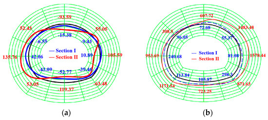 The internal force of the lining monitored on site is plotted in Figure 7. The bending moments of sections I and II are all butterfly-shaped with a center-to-lower left bias, while the axial force exhibits a “large in the middle and small at the upper and lower ends” distribution pattern.