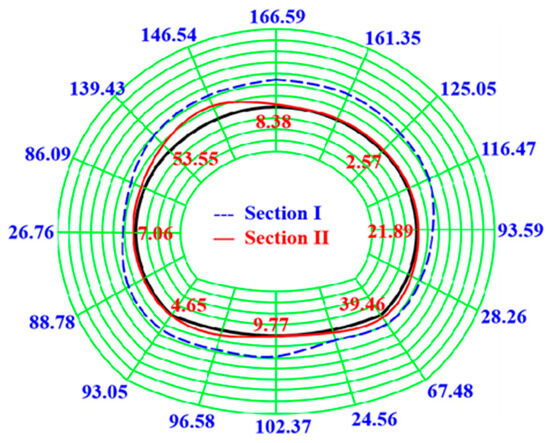 It can be seen that the soil pressure in section I decreases sharply during the excavation phase, with a decrease from the initial 1.6 MPa to 0.5 MPa at the vault and a decrease from the initial 2.79 MPa to 0.1 MPa at the inverted arch. The rock mass in this phase is in the “unloading” state, and the decreased rate of soil pressure at the inverted arch is greater than that at the vault. When the primary support is completed, the soil pressure appears to “rebound” until it reaches stability. The soil pressure at the inverted arch changes very little, as the inverted arch is squeezed the least and the vault is squeezed the most. The soil pressure in section II during the excavation phase is smaller than that in section I, while the soil pressure “recovery” in section II during the support phase is faster than that in section I. Due to poor pressure-bearing and self-stabilizing capacities of rock mass in section II, the primary support and secondary lining bear most of the self-weight of the rock mass in the fault area after the completion of the primary support.