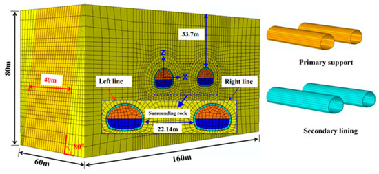 This study employs the finite element software ABAQUS 2020 for simulation; the development of the model is mainly based on the description of the design of the Jinyunshan tunnel (Figure 9) and an in-site construction program. Considering the influence of boundary effects on the model, the final dimensions of the model are X × Y × Z = 160 m (length) × 60 m (width) × 80 m (height), with a fault width of 40 m and a dip angle of 80°. The model is developed with 68,844 elements and 76,959 nodes. Considering that the tunnel depth is 140 m, an equivalent load of 2.8 × 105 Pa and an equivalent pore pressure with a head of 100 m are applied to the top of the model to simulate the deeply buried water-abundant environment. Normal displacement constraints are set at the front, back, left, and right boundaries of the model, while the top is free and the bottom is fixed. The seepage model is isotropic, and the bottom, front, back, left, and right boundaries of the model are set as impermeable boundaries. The primary support and excavation face are set as permeable boundaries with a pore pressure of 0. The rock mass is saturated before the tunnel’s construction.