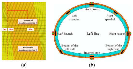 To facilitate the comparison with the in situ monitoring data, the monitoring sections, and the locations of the monitoring points in the numerical model are consistent with those in the field monitoring. The monitoring items include the displacement of primary support, water pressure outside the primary support, soil pressure, and the structure’s internal force of the secondary lining. The monitoring point arrangement of the numerical model is displayed in Figure 10.