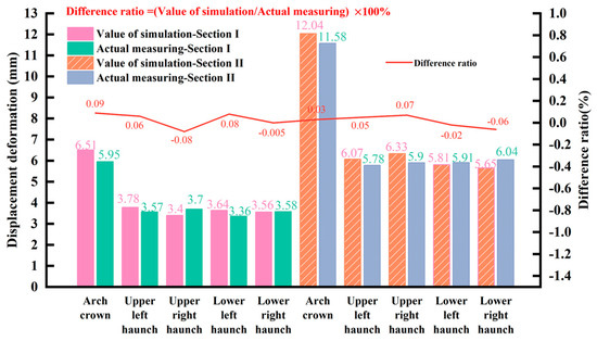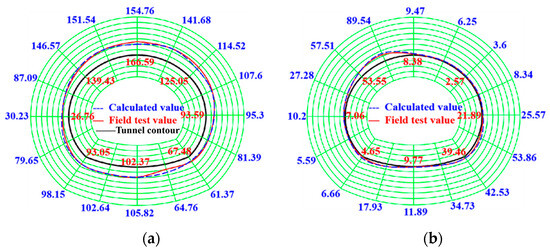 The safety factors derived from the numerical simulations for both sections are presented in Figure 16. As depicted in Figure 16, the safety factors of the lining for both sections exceed 2.4, indicating that the structures in both sections are in a safe condition. The smallest safety factor of 26.76 in section I is located at the left arch haunch, suggesting a certain safety margin. The minimum safety factor of 2.57 in section II is situated at the right spandrel. During the construction process, special attention should be paid to the right arch spandrel in section II, and appropriate reinforcement measures should be taken to ensure safe construction. The simulation results of the safety factors are generally consistent with the field monitoring outcomes.