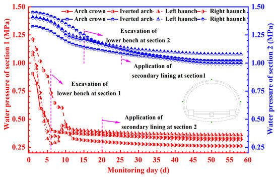 The time-dependent curves of water pressure outside the primary support for both sections are displayed in Figure 14, which can be categorized into the three phases of rapid change (excavation phase), continuous change, and slow change.