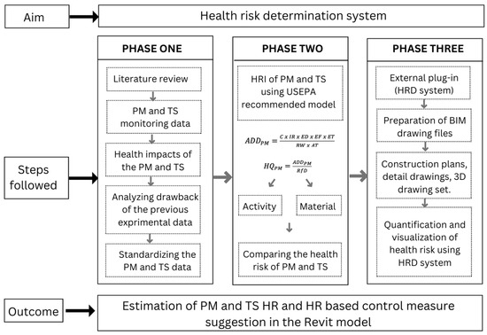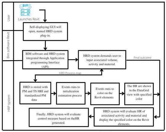 In the vanguard of innovative construction safety, this study propounds a BIM-based system named Health Risk Determination (HRD). This system seamlessly integrates the USEPA calculation method incorporating the authors’ suggested standardized HRI values for PM and TSs within BIM. This heralds a transformative era in mitigating HRs for workers involved in construction projects. This section provides a comprehensive overview of the system architecture and functionalities of the HRD system. The process map is stated in Figure 2.