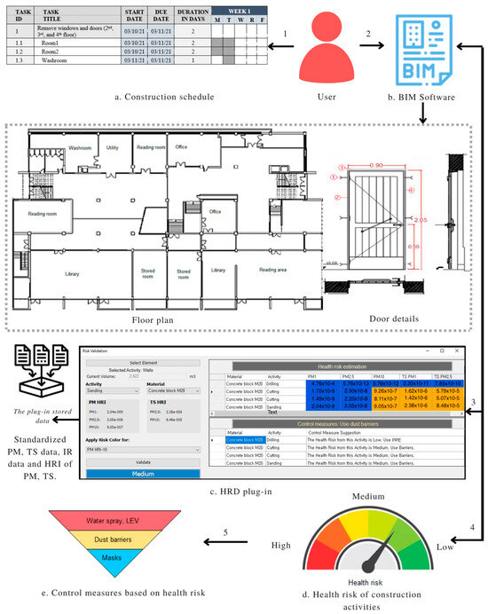 The authors meticulously orchestrated a series of systematically designed and feasible steps to develop a predictive system for PM and TSs, and to implement corresponding control measures through Building Information Modeling (BIM). The implemented measures, along with the information flow across each phase, are depicted in Figure 1. To construct an HRI, we utilized previously published data on PM and TS, creating a standardized database that encapsulates the HR associated with various construction activities and materials, in accordance with the USEPA HR model. For practical implementation, it was imperative that this system seamlessly integrates with the BIM model of any given construction project, highlighting HR concerns. Consequently, the authors developed a Revit-based plugin, capable of extracting the newly formulated HRI and interfacing it with the building plan, thereby enabling the delineation of HR values for specific construction activities and respective control measures. The following sections provide an in-depth description of each step in this process.