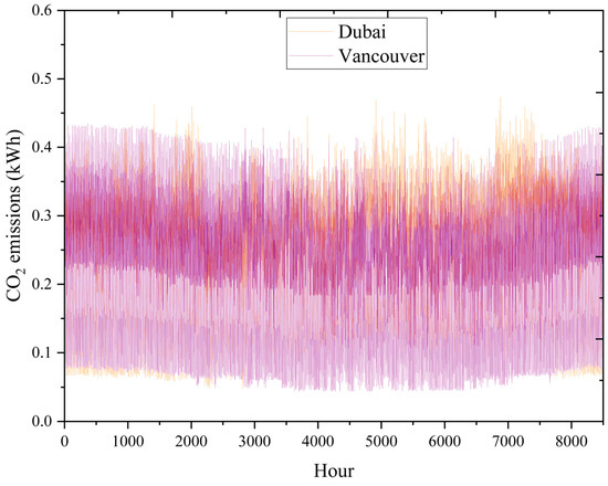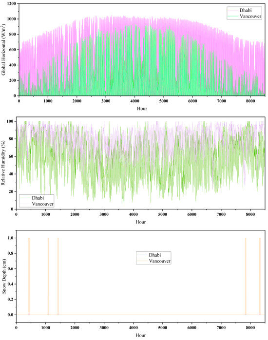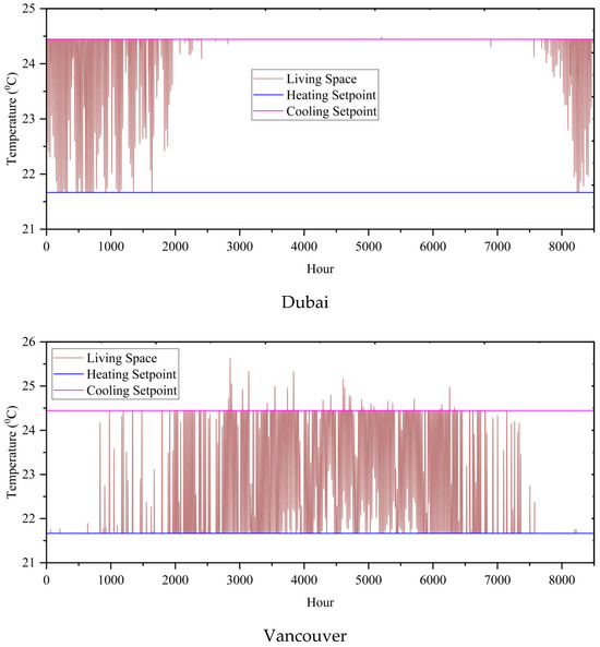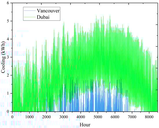 In Figure 4, hourly changes in ambient temperature (8760 h) are plotted for the cities of Dubai and Vancouver. The temperature changes in Vancouver are between −10 °C and 25 °C, and in Dubai the temperature is between 0 °C and 50 °C.