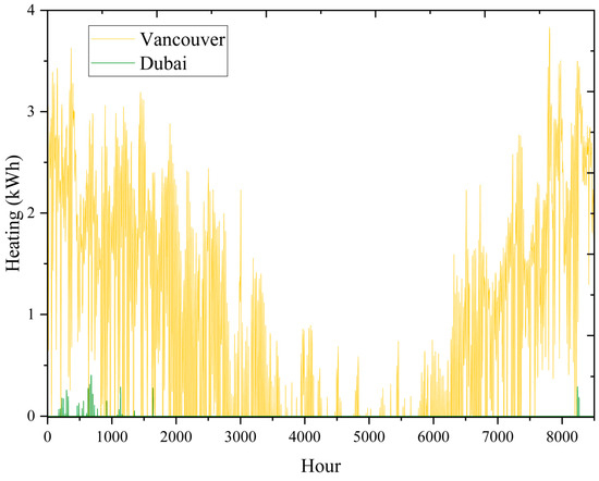 In the following paragraphs, the load analysis of the residential complex and the conditions of the residential complex in the two study cities will be discussed. In Figure 6, the results of the amount of heating load consumed by the residential complex are presented hourly for two study cities. As the results show, in the city of Vancouver, the amount of heating load required by the residential complex is higher than the cooling load, and in the city of Dubai, the cooling load is higher due to the hotness of the area. The annual heating consumption of the Vancouver residential complex is between 0 and 4 kWh, and in Dubai it is between 0 and 0.5 kWh.