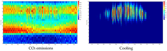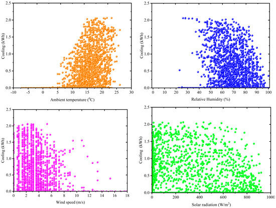 Figure 7 shows the changes in cooling energy consumption of the residential complex hourly and monthly for one year. As the results show, in the city of Vancouver, the amount of cooling load required by the residential complex is low, but in the city of Dubai, due to the high solar potential and also the high temperature of the environment, the cooling load is very high. The cooling consumption of the Vancouver residential complex is between 0 and 2 kWh, and in Dubai it is between 0 and 5.5 kWh.