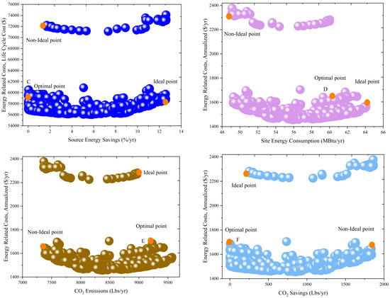 In Figure 9, the results of the reduction in CO2 emissions for one year according to the optimization of residential complex energy consumption in two study cities are presented. As the results show, with the reduction in electricity consumption, carbon dioxide emissions also decrease, and electricity consumption is the main option for carbon dioxide emissions.