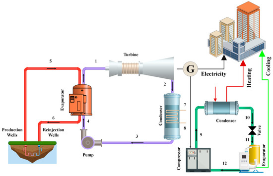 Figure 16 shows the proposed schematic. The system investigated in this research consists of a geothermal system, organic Rankine cycle, and compression chiller for cooling and heating production. Using the geothermal heat source, the thermal energy needed by the evaporator for operation is supplied and then transferred to the turbine to generate power. The temperature of the fluid that this tank injects into the cycle is equal to 180 °C. Also, the fluid mass flow rate is considered to be 1 kg/s. The organic fluid used in the current system is R123. When it enters the evaporator, it reaches the boiling point by absorbing minimal heat from the fluid around the tubes and evaporates, and, as a result, its phase changes from liquid to gas.