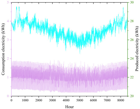 In Figure 8, the results of the electricity load of the residential complex are presented hourly for one year. The electricity consumption of the residential complex in the two study cities is between 0.1 and 2.2 kWh during the year.
