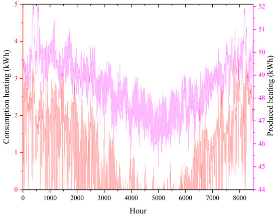 Figure 23 compares the heating energy consumption of the simulated residential complex in the city of Vancouver and the amount of heating produced by the system with the climate changes in the city of Vancouver on an hourly basis. As the results show, the proposed geothermal system can provide the required heating for the building.