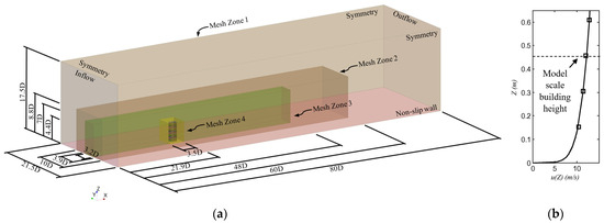 A CFD simulation [64,65,66] employs an LES model with computational domain dimensions shown in Figure 2a. The computational domain consists of four different types of boundary conditions, which are as follows. The non-slip wall boundary condition is assigned to all ground and walls of the studied structure. Symmetry boundary conditions are considered for the sides and top faces of the computational domain to mirror velocities and pressure characteristics across these surfaces. The inflow boundary condition is located at the front surface of the computational domain to utilise a database for each velocity component depending on both its location and time (e.g., (x, y, z, and t)). This has been previously generated using a Consistent Discrete Random Flow Generator (CDRFG) technique developed in past studied [57,58,67]. The outlet is the rear surface of the computational domain to model the outflow, consistent with the CDRFG inflow shown in Figure 2b [57], which is represented as the mean wind velocity () distribution, illustrated in Equation (1).