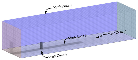 Within the computational domain, a grid discretization must be considered where hexahedral meshes are used. Table 1 summarises the grid resolution and properties for the isolated CAARC structure. The grid used in the computational domain is divided into four zones, as indicated in Figure 3. Starting from the furthest away from the structure of interest, Zone 1 is considered the largest grid. Closer to the structure, Zone 2 and Zone 3 are deemed to have medium-sized grids. The last zone, Zone 4, is considered closest to the building of interest, with the smallest grid size. Compared to the other three grid zones, a decrease in grid size will capture essential flow details around the structure in the wake zone and from the zones between the inflow boundary condition (as previously mentioned) and the structure of interest. Grid zones are chosen based on Aboshosha et al. [57] and Elshaer et al. [58] and are validated with similar comparisons shown in Figure 4a,b. With the validated grid zones, a total number of mesh cells are counted. The mesh count considered was refined in a study by Elshaer et al. [58] and was found to be adequate for their analysis.