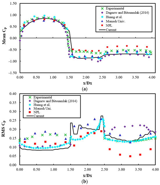 (a) Mean and (b) RMS Pressure Coefficient at 2/3 of the reference height of the CAARC building [61,71,72].
