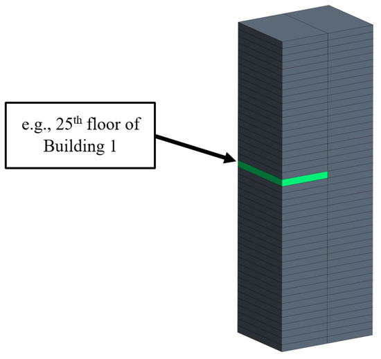 After simulating the structures in proximity using FEM, the dg,min between structures can be determined. If the dg,min between the two adjacent structures is exceeded by both the building’s lateral deflections, an interaction (pounding) will occur. This interaction will be discussed in the following section, Section 2.2.3. In order to accurately simulate the interaction between two adjacent structures when subjected to extreme winds, each building is considered independent and acts self-standing. Nonetheless, each structure has its own individual dynamic responses and vibrations based on the applied wind forces at a specific time frame. Each structure is modelled as an elastic, multi-degree-of-freedom system and will act as a moment-resisting frame. If pounding occurs, both longitudinal and transverse forces will be captured. The influence of the dg,min on the pounding effect from the two colliding structures is parametrically examined in this investigation. The point of contact if pounding occurs will occur between the stories’ floor diaphragms (among the storey masses). This assumption is believed to be suitable because the studied structures have identical storey heights and overall building heights.