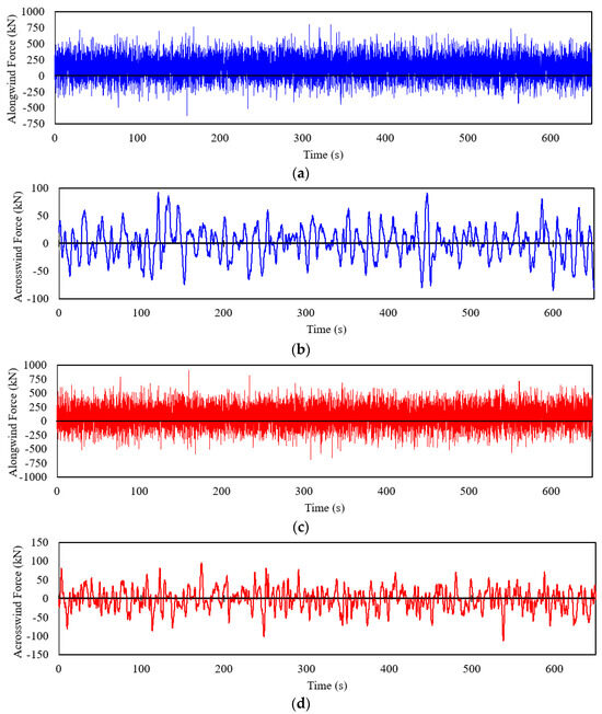 Forces’ time–history on the 45th storey of structure for (a) along-wind (x-direction) upstream building, (b) across-wind (y-direction) upstream building, (c) along-wind downstream building, and (d) across-wind downstream building (full scale).