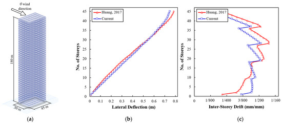 (a) FEM CAARC model dimensions, (b) maximum deflection of storeys, and (c) maximum inter-storey drift in the along-wind direction [62].