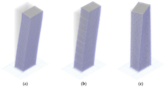 The full-scale CAARC structure is 180 m tall, with 45 similar storeys (each storey is 4 m in height), with a 10-bay-by-15-bay steel rectangular skeletal framework, as seen in Figure 8a. Each bay is 3 m wide. The validated CAARC structure’s steel size members are based on the work of past scholars [61,62], and designed based on a preliminary strength check according to the AISC steel code (2001) to accurately replicate the validated model, as previously mentioned in Section 2.1. The steel columns and beams are selected based on the W14 and W30 sizes, respectively. The remaining structures (e.g., 140 m, 100 m, and 60 m) will be designed similarly to maintain the preliminary strength check (see Table 2). A fixed ground connection is considered to give the overall building a rigid floor connection. The structure acts as a moment-resisting frame, transposing forces from the beams to the columns and to the fixed ground connections. The steel structures’ modal damping ratios are at 2% to calculate the dynamic drift responses, as the damping ratio was utilised and validated based on the work of Chan et al. [61] and Huang [62]. The density of steel is considered to be 7850 kg/m3, with a Young’s modulus and Poison’s ratio of 200,000 MPa and 0.25, respectively. The first, second, and third modes are found to be at 0.198, 0.281, and 0.361 Hz, respectively, and they were validated with acceptable frequencies based on the work of Huang [62]. This can be visualised in Figure 9, representing the first three mode frequencies of the standard CAARC structure. Based on their height and applied time–history mean wind velocity, all examined structures produced different natural frequencies.