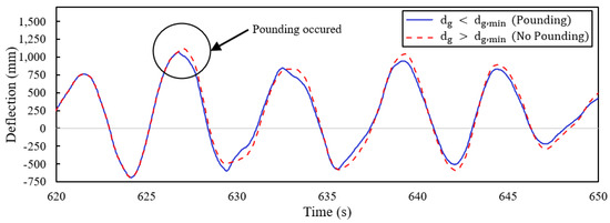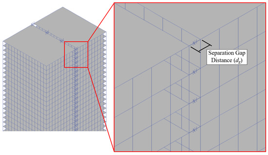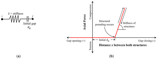 In order to accurately capture forces of the two adjacent structures during pounding, a compression-only gap element in the FEM analysis is considered, see Figure 12a. The compression gap element considers a specified “gap distance”, resembling the separation distance between the two adjacent structures. When this specified gap distance reaches a value of zero, only then will the gap element act as a compression spring. This will record the compression values throughout the applied time–history wind analysis and monitor each structure if any part of the structure comes into contact with the adjacent building (i.e., beams, columns, or slabs) [75,76], as shown in Figure 12b. As this study examines the necessary dg,min required to mitigate pounding, the local effects and progressive collapse of the structure’s columns, beams, and slabs are not considered for this modelled analysis, as it only affects the performance of the structure during and after the pounding effects.