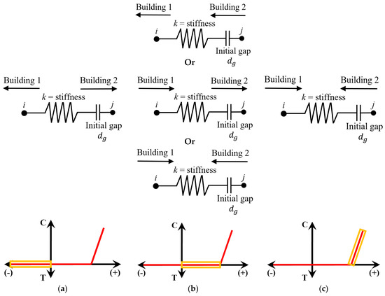 When examining the adjacent structures in proximity subjected to a time–history wind analysis, the contact gap elements will apply in three scenarios. The first instance considers when the first (upstream) structure is either stationary (structurally stable) or laterally deflecting in a negative x-axis direction. In contrast, the second (downstream) structure is either stationary (structurally stable), laterally deflecting in a positive x-axis (opposite of the first structure), or laterally deflecting in a negative x-axis direction that is lesser than the separation gap distance (dg) and the first structure’s lateral deflection combined. The gap element in this scenario will act as an opposing compression force (tension), making the gap element inactive as no contact (pounding) between the two structures has occurred (see Figure 13a). The second scenario consists of the first structure laterally deflecting in a positive x-axis direction. The second structure is either stationary (laterally stable), deflects in a more significant positive x-axis direction than the first structure, or deflects in a negative x-axis direction where the summation of both structures’ lateral deflections is lesser than the dg between both adjacent structures. In this scenario, the gap element will consist of a positive compression value; however, since the dg is not exceeded, the gap element will remain inactive as no contact (pounding) between the two adjacent structures has occurred (see Figure 13b). The third scenario occurs when the summation of both structures’ lateral deflection exceeds the dg between the adjacent buildings. This will produce a positive compression value from the contact (i.e., structural pounding) between the examined structures, ultimately leading to an active compression spring force, allowing the gap element to monitor the pounding forces over the allocated period (see Figure 13c).