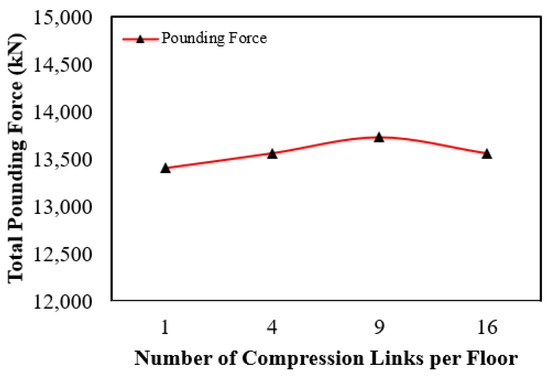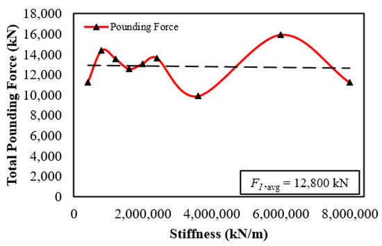 V, kT and are shown in Figure 14 to represent a 10-storey skeletal frame structure with applied wind force, V. Equation (3) is then rearranged to determine kT in order to determine k for the gap element. Once kT is defined, a multiplication factor of 50–100 times is applied [80]. Therefore, a single applied force, V, of 106 N is considered to act only on the top storey diaphragm of the 45-storey structure, perpendicular to the longest side of the building (i.e., 45 m long side). This is equivalent to the base shear force of the structure. A maximum lateral displacement () of 82.64 mm was determined, meaning the overall stiffness of the structure (kT) is approximately N/m. A compression gap element stiffness (k) per storey of N/m was determined from . To assure that the acquired k is sufficient for all examined structures, a comparison with altering k (i.e., 6.6k, 5k, 3k, 2k, 1.66k, 1.33k, k, 0.66k, and 0.33k) was performed. It is found that the FEM captures an average pounding force of 12,800 kN for various gap element stiffnesses, k, as shown in Figure 15. Therefore, a N/m is determined to adequately capture the average pounding force for all the examined models.