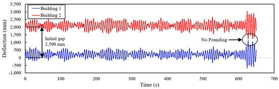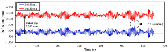 Thorough studies have been performed to improve safety precautions to avoid pounding risk. Such precautions evaluated and developed an adequate separation distance between possible pounding structures to prevent contact during potential extensive lateral-load occurrences [46,47,48,49,50,51,52,53]. Additionally, when designing and planning for newly constructed structures, pounding risk can be assessed for existing structures to avoid the occurrence of structural pounding. However, many pre-existing structures already in proximity have been built with an insufficient separation distance due to old design codes and previsions, leading to pounding damage [54,55]. The majority of structural building codes identify the requirements for building deflections. A limited selection of structural building codes fails to identify a required minimum separation distance for possible structures located in proximity during hazardous wind events. Alternatively, other mitigations can be justified to limit damages from structural pounding if insufficient or no separation distance between such adjacent structures can be enabled. Despite rigorous research from scholars relating to structural pounding, an adequate separation distance was not correlated to the adjacent structures’ dynamic properties or the lateral loads [56]. Such deflections depend on the structure’s height, modal period, and the applied lateral load. The applied lateral load (e.g., wind events) can lead to out-of-phase vibrations arising from the possible structural pounding.