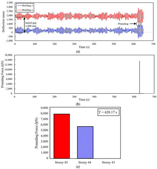 The parametric study used FEM analysis to calculate the lateral deflections of two adjacent tall structures in order to determine the adequate dg,min to avoid wind-induced pounding. A graphical comparison of the two adjacent structures is shown in the following figures, representing their lateral displacement responses (sufficient dg,min for preventing a pounding event). Figure 18 shows the time–history of the two adjacent 180 m tall structures (acting on the 45th storey for their lateral deflection) subjected to a synoptic wind with a mean velocity of 40 m/s at a building height with a dg at 2000 mm. The dg,min required to prevent a collision for this scenario at the top of both structures is 1898.64 mm. It can be noted from Figure 18 that at the time instant of 628 s, both structures have a significant spike in their lateral sway. Such lateral deflection based on the structure can occur due to the natural sway frequency of a building with a similar natural frequency of vortex shedding acting on the specific structure as the applied mean wind velocity. This will cause the structure to have a dramatic spike in its sway with a lower mean wind velocity than the deflection of a structure with higher applied mean wind velocities. Figure 19a shows the collision (i.e., pounding) of the two 180 m tall adjacent structures with a dg equal to 1800 mm. As shown in Figure 18, the dg between structures is 2000 mm and came into proximity at 628.17 s; however, no collision of the structures occurred. Since the gap elements are not activated, no forces were produced because the structures did not come into contact. Therefore, Figure 19a came into contact at the same time, since the dg reduced to 1800 mm, even though the required dg,min was concluded to be 1898.54 mm. Figure 19b,c display the pounding forces acting on the two structures when a collision occurs (t = 628.17 s). Figure 19c compares the forces applied at storeys 45, 44, and 43 when the pounding of structures occurs.