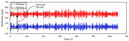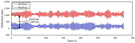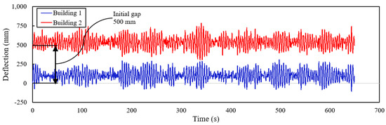 Time–history displacement of 180 m structures with initial gap distance at 2500 mm.
