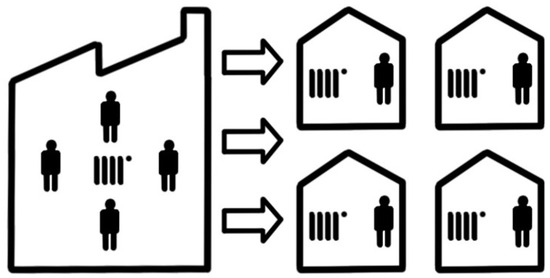 As shown in Figure 2, in fact, considering that the minimum cubature of a classic office room, e.g., that of a public administration, must be at least 10 cu. m. per employee, multiplying by the number of employees present (4) and dividing by the mandatory minimum height (2.7 m for residential), we obtain approximately 15 sq. m. per employee. This size turns out to be the same as required for the living room (minimum 14 sq. m.) of a residential building [15,16]. Assuming for approximation that both rooms (office and living room) have a similar number of radiant elements, it can be assumed that during the periods spent working at home, the energy consumption required to heat the classic office room is no longer shared by the four colleagues but must be multiplied by four, i.e., to heat each individual room, in this case the living room, in which each employee worked. (NB: this is of course only an example estimate, but it is intended to quickly show the effects of the lockdown and the impact on individual homes.)