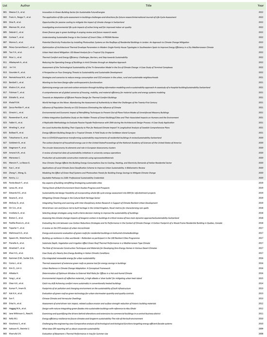 List B—intersection of the sustainability–climate–building keywords [54,55,56,57,58,59,60,61,62,63,64,65,66,67,68,69,70,71,72,73,74,75,76,77,78,79,80,81,82,83,84,85,86,87,88,89,90,91,92,93,94,95,96,97,98,99,100,101,102,103,104,105,106,107,108,109,110,111,112,113,114,115,116,117,118].