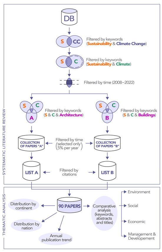 This operation allowed us to arrive at under 1000 available data, namely 798 articles, obtained from the union of two collections of data: the first of 124 articles, obtained from the intersection of the sets referring to the three keywords sustainability–climate–architecture, and the second of 674 articles, obtained from the intersection of sustainability–climate–building.