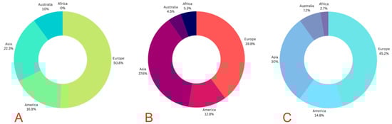 Papers distribution by continent ((A) pre-COVID-19, (B) post-COVID-19, and (C) total).